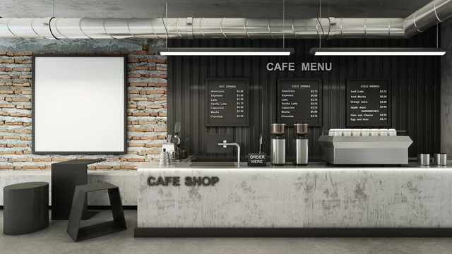Cafe Shop Restaurant Design Minimalist Loft Counter Concrete Top Counter Metal Mock Up On Brick Wall Menu Board On Wall Back Counter Black Metal Concrete Floors 3d Render Stock Illustration Adobe Stock
